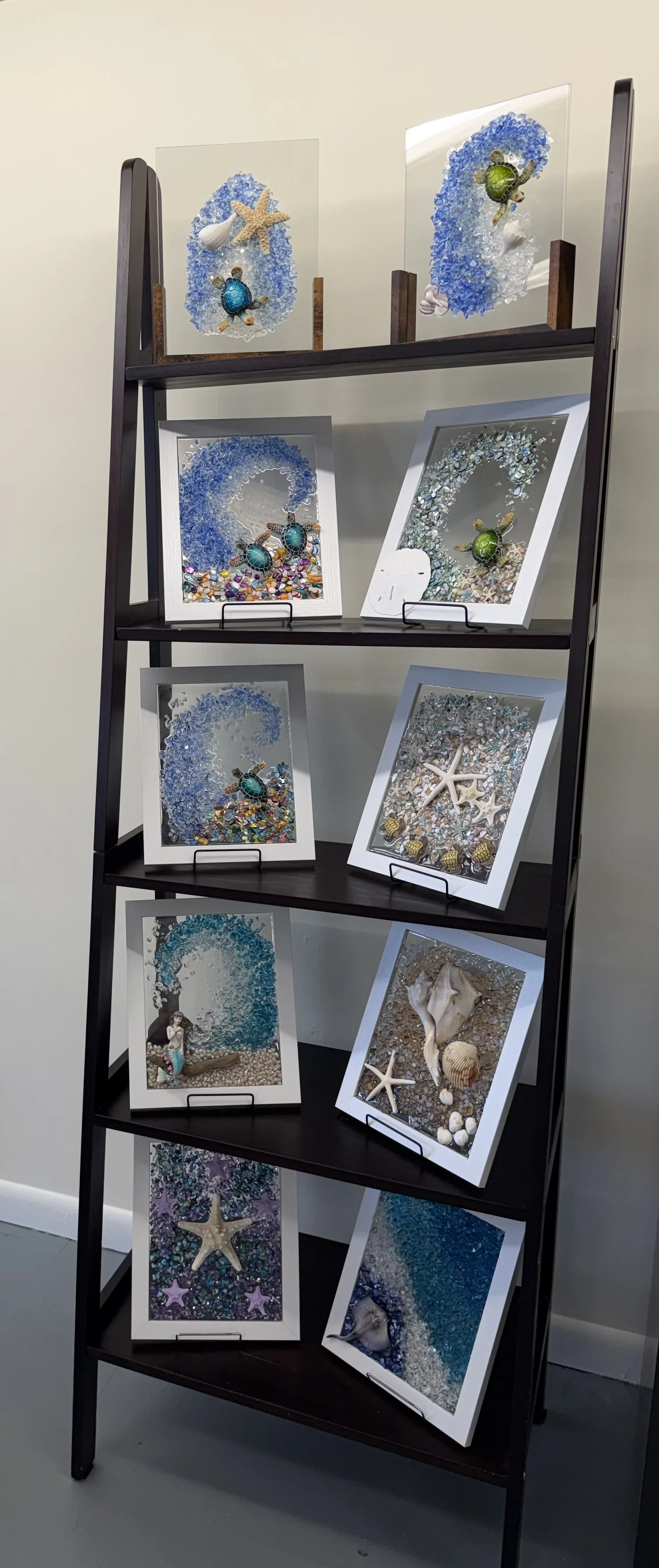 Choose from an assortment of charms, shells, glass pieces, and themed pieces to craft your design, then learn how to seal and finish your artwork with a glossy resin coating for a beautiful, glass-like effect that preserves your creation.